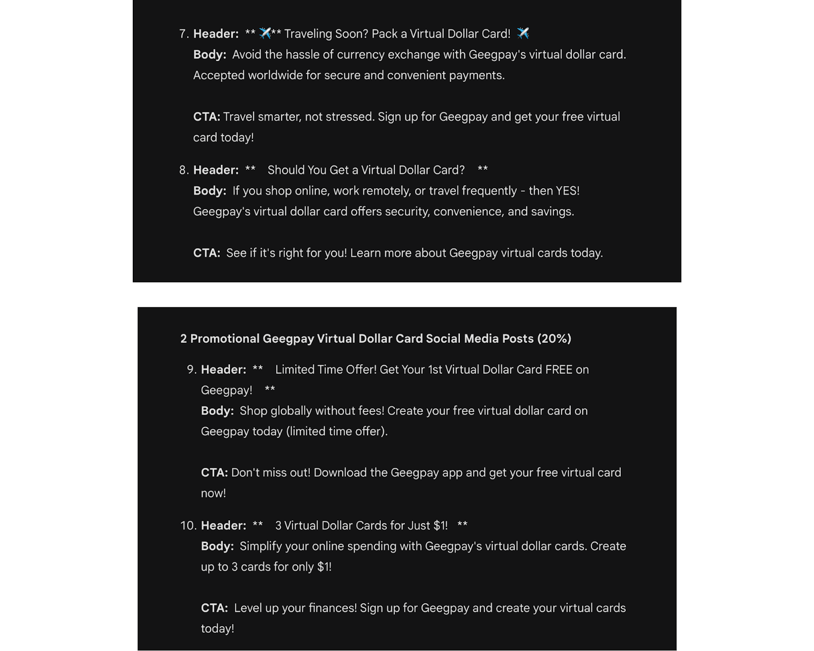 ChatGPT: Focused more on promoting the dollar card feature, resulting in 100% promotional content. Most headers were generic and mentioned Geegpay frequently, which was unnecessary.