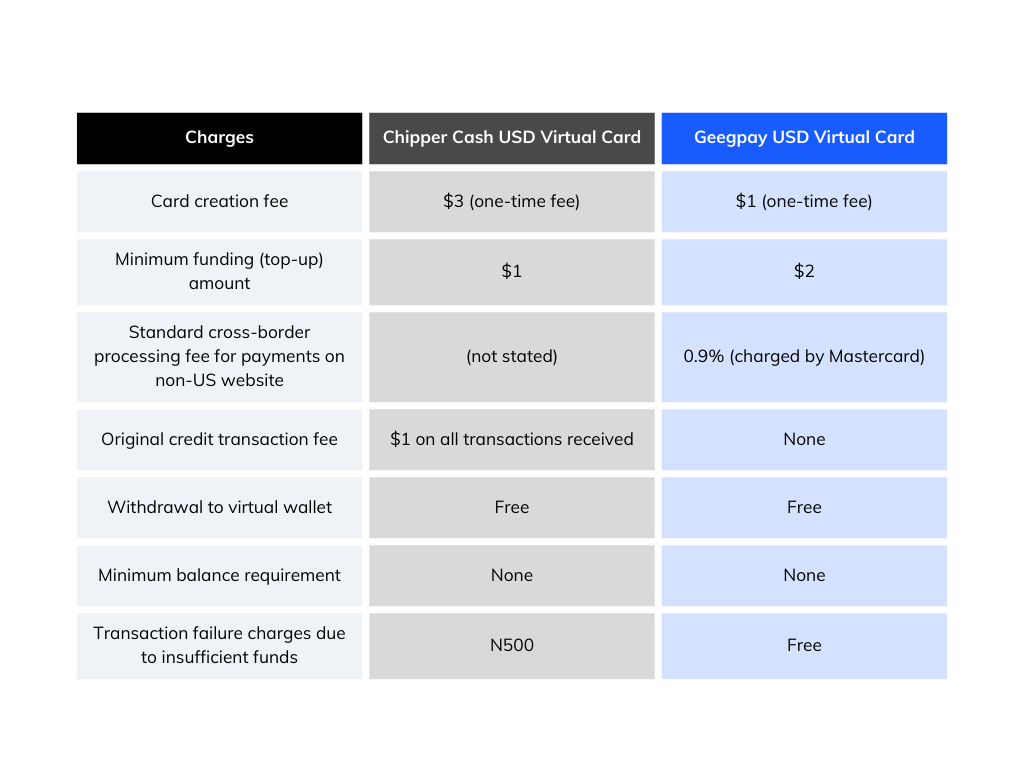 Let's also look at the fees attached to each of these cards, as this is an important factor when making international payments. You want to ensure you’re getting as much value for your payments as possible. Here’s a breakdown of the fees attached to the Chipper Cash and Geegpay virtual dollar cards: