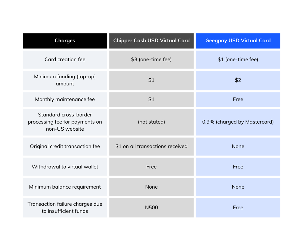While both Chipper Cash and Geegpay charge a one-time virtual card creation fee, Chipper Cash’s fee is significantly higher at $3, compared to Geegpay $1 fee.