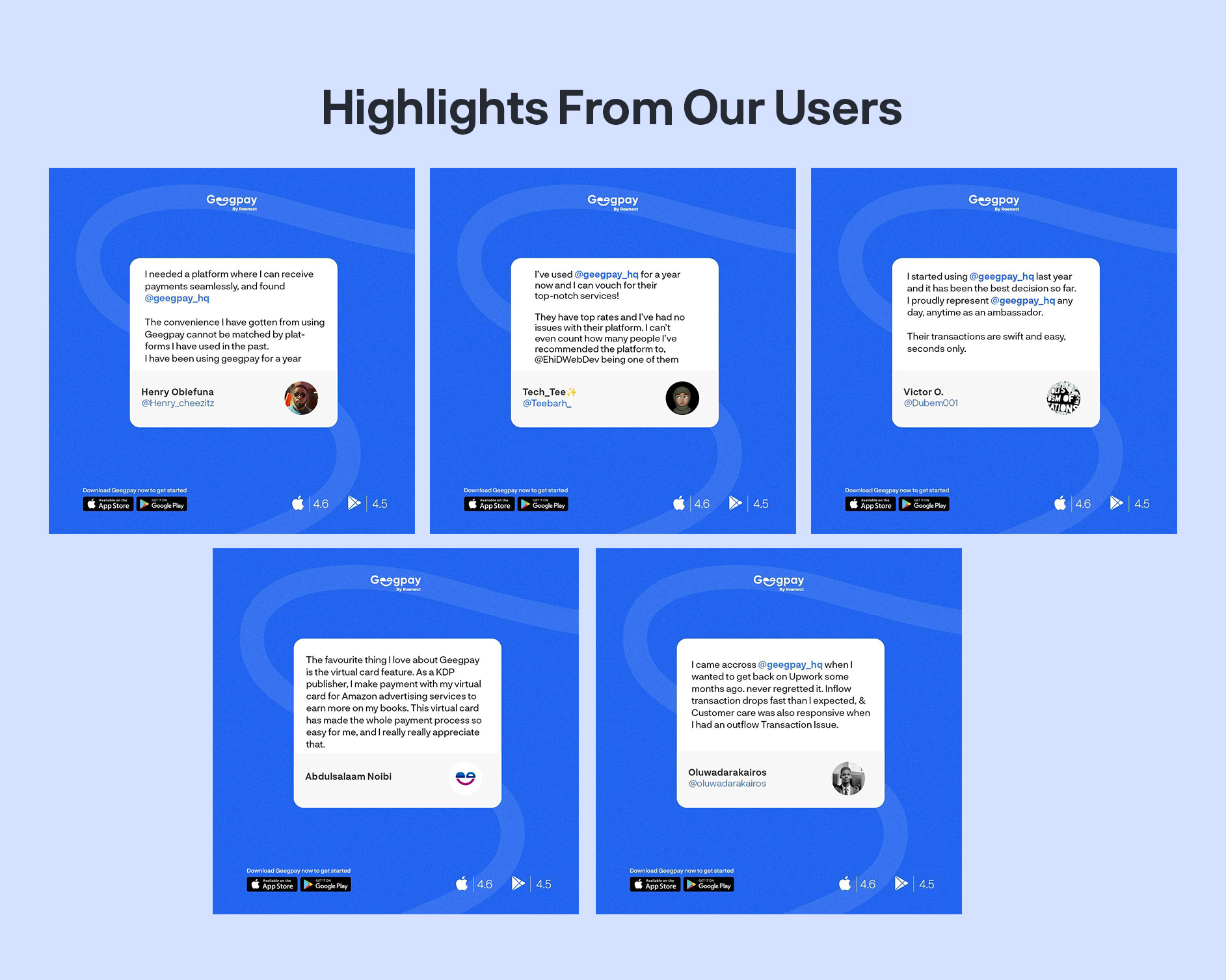 Our users have shared their thoughts about using Geegpay, and we are proud of the experiences they've had with us. We would love to hear from you as well. Your feedback helps us grow and continue building what you enjoy. If you have had a moment with us worth sharing, kindly leave us a review on our socials. We look forward to reading it. And if you're yet to create a Geegpay account, now's the best time to do so.