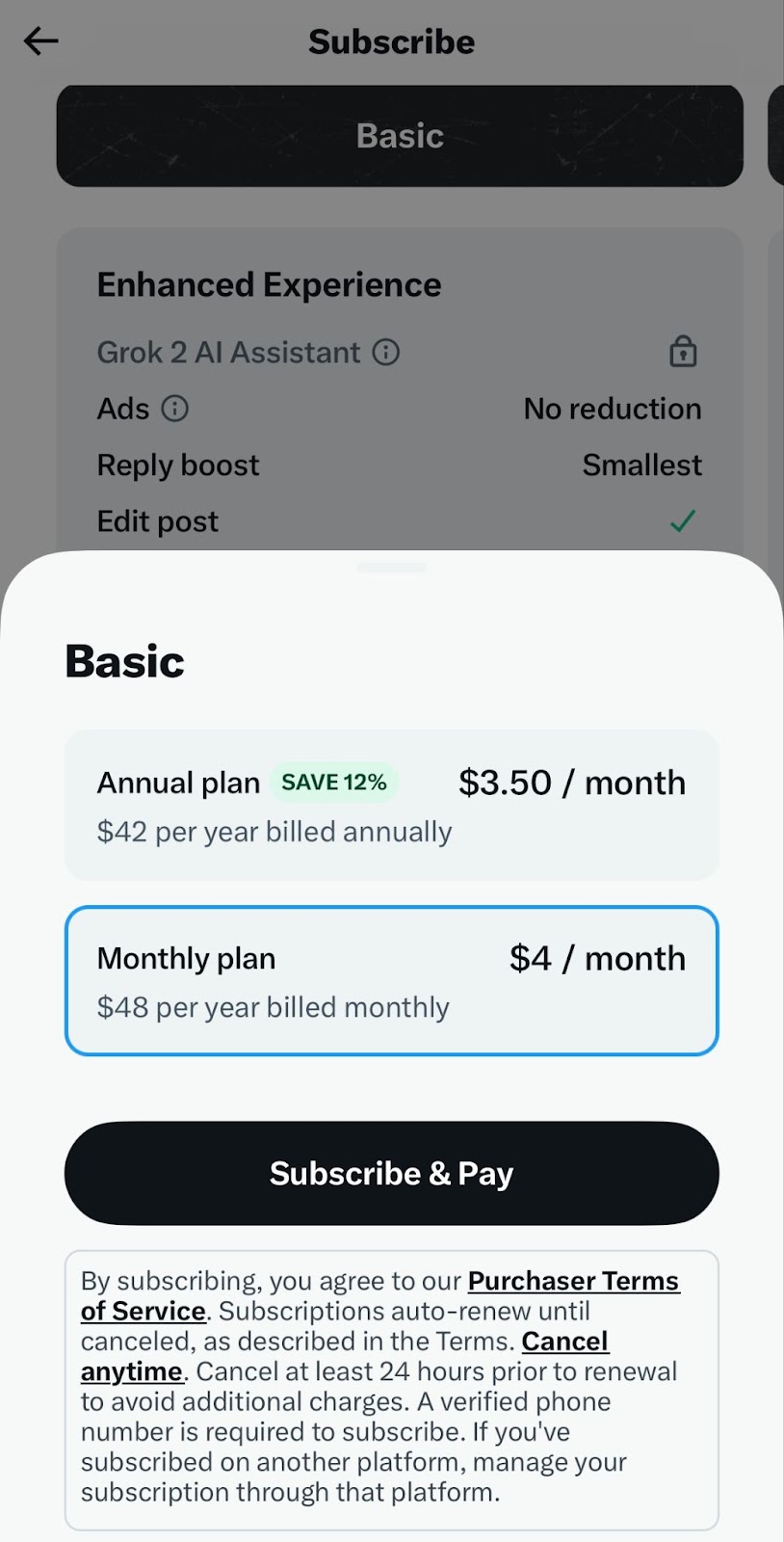 - Select the Subscription Plan you want. X currently offers three options: Basic, Premium, and Premium+. Each plan has unique features, so swipe through the details to choose the one that fits you best.