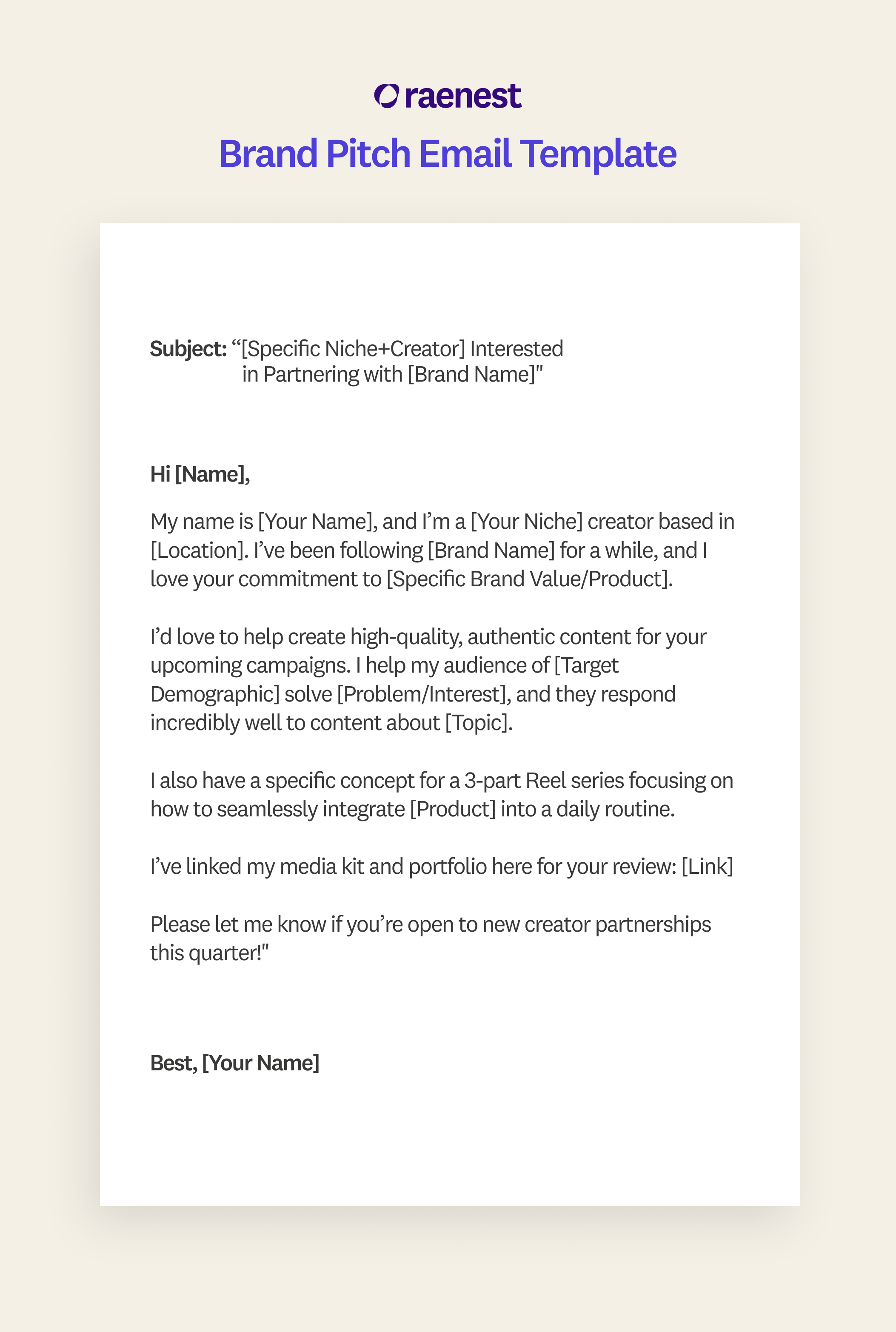 Your subject line is your first impression. Keep it clear, specific, and enticing. Inside the email, you need to answer three questions quickly: Who are you? Why them? What can you do for them? Avoid sending a UGC creator pitch that just says "Collab?" or asks for free stuff immediately.