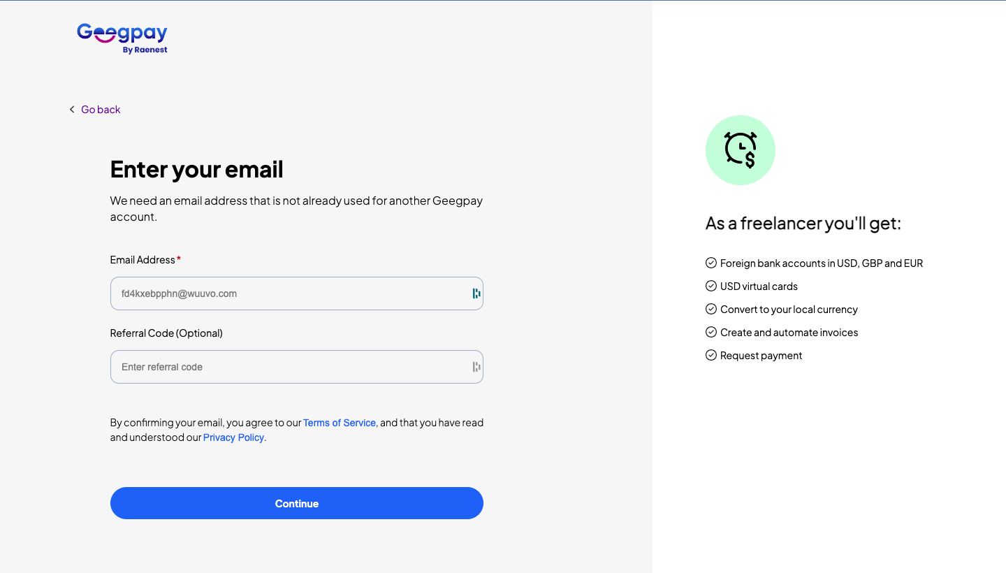 To embark on your Geegpay journey, head to https://me.geegpay.africa/ and click the "Create account" button. Select Freelancer and fill in your email address, where a verification code will be sent to. You’d be prompted to enter the verification code after which you’d create a password. Please note you can only have one account, if you create multiple accounts they will be both blocked.