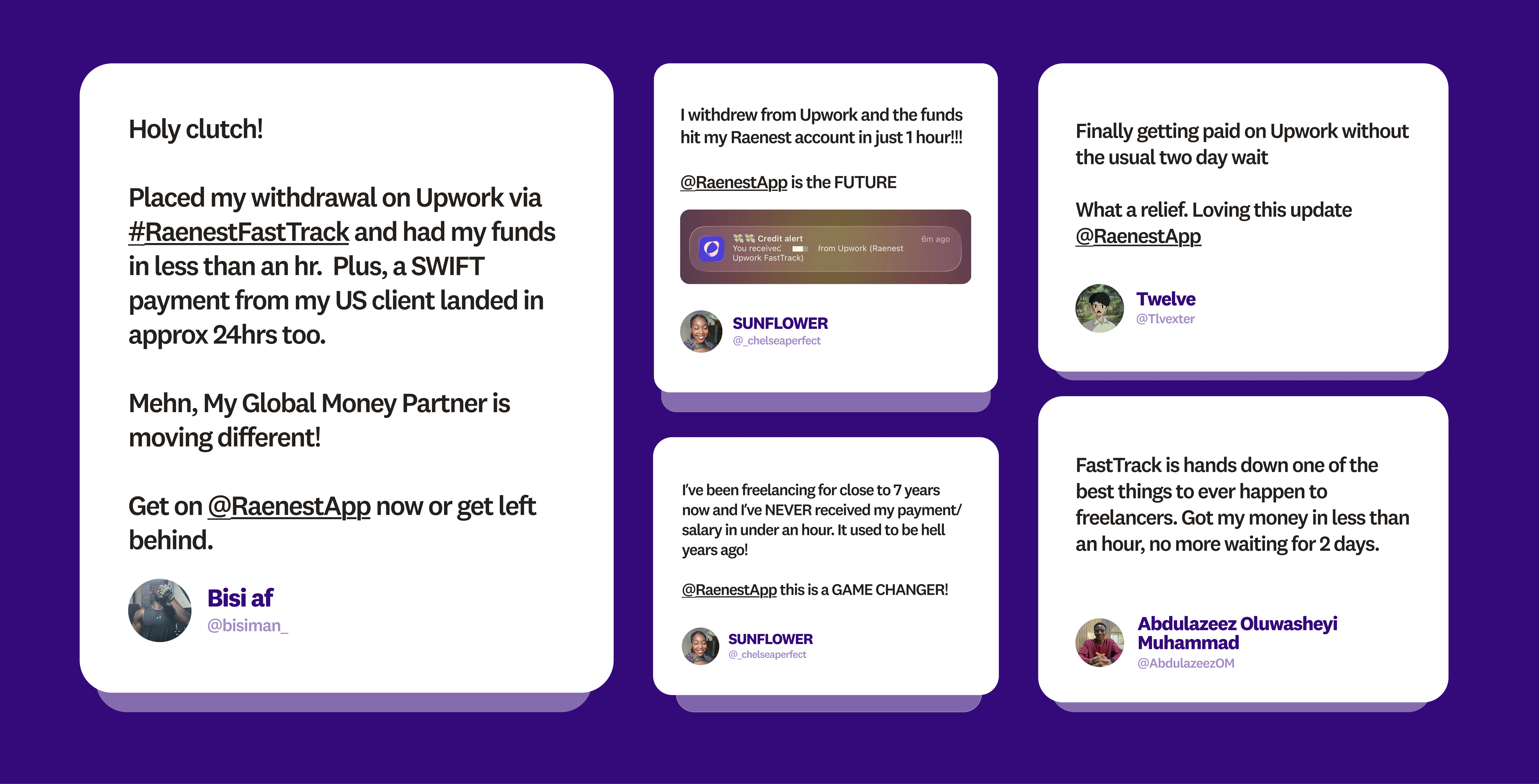 There was a time when people could only dream of getting their Upwork earnings in under an hour. Then Raenest FastTrack was born. Now, many have lived that dream and have great things to say: