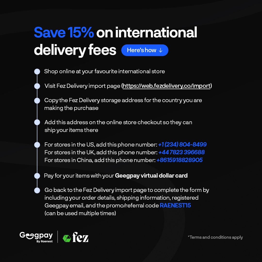 Geegpay is partnering with FEZ DELIVERY to make global shopping and payment so much easier. Now, Nigerian shoppers can shop at their favourite international stores like Zara, Aliexpress, Temu, Ebay, Asos, Shein, and Amazon using their Geegpay virtual USD card and use the promo code, RAENEST15, to get 15% off delivery fees when they ship their purchases home to Nigeria with FEZ DELIVERY.