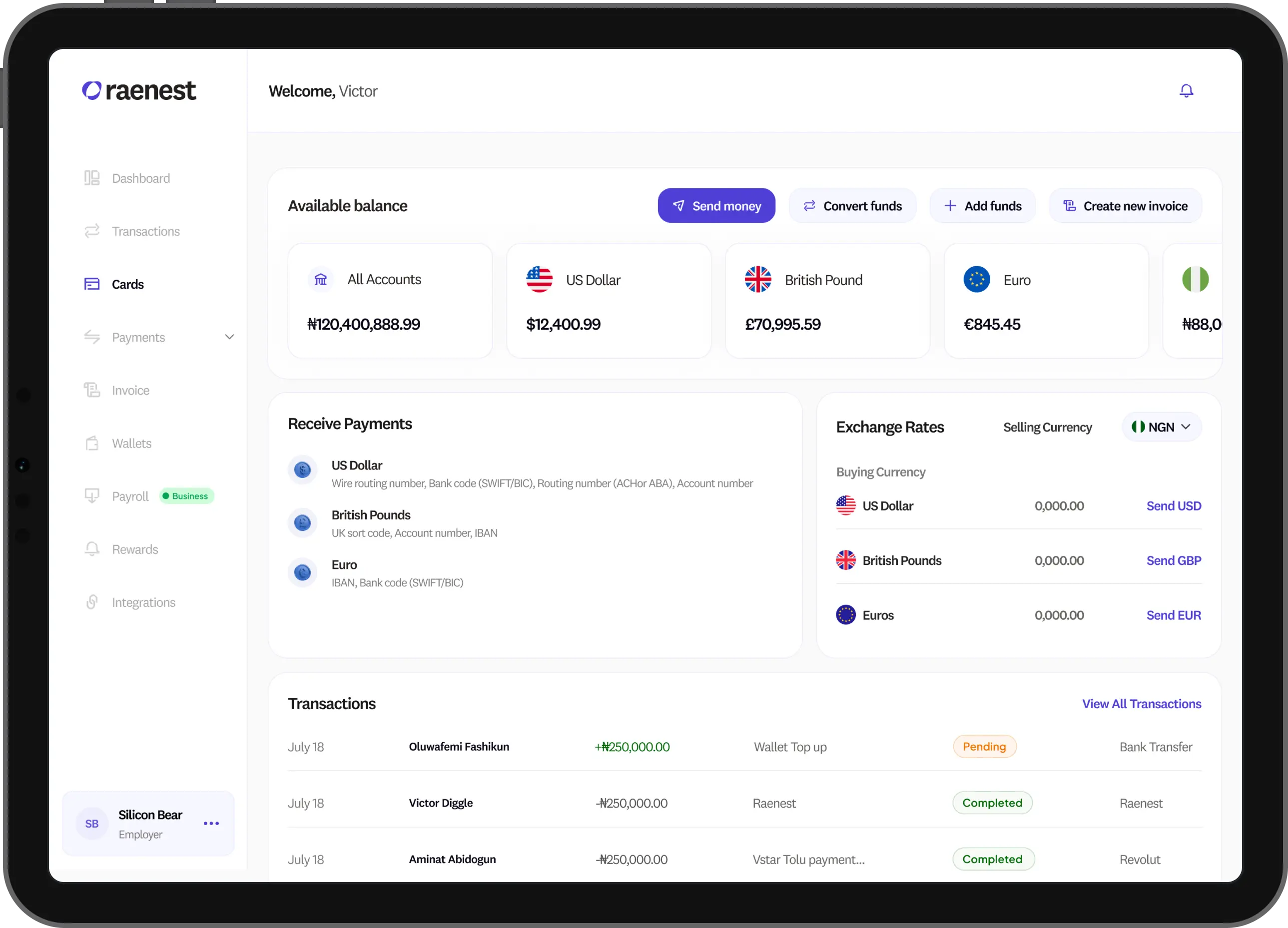 Raenest is a financial technology company and not a bank. Banking services are provided by Geegpay’s payment partners & banks who are authorised by the CBN, FCA, FDIC, and other regulatory bodies. Debit Card Services are issued by Raenest’s technology partners who are authorised by VISA and Mastercard to carry out card services. Raenest might refuse to open an account, verify or maintain an account that violates applicable laws and the Terms of Service.