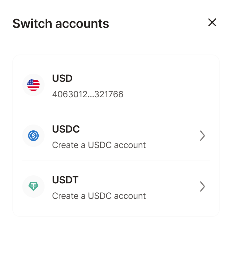 Select 'Create Stablecoin account from the USD drop-down. Fill a short questionnaire.